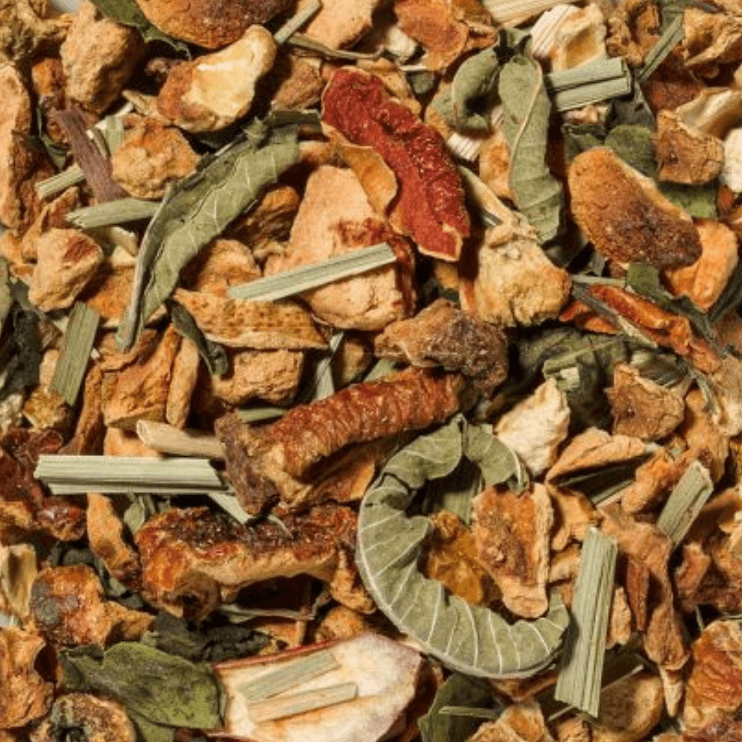 | Ingrediënten | Appel stukjes, citrus schil, appel plakjes, citroengras, kaneel, citrus plakjes, natuurlijk citrus aroma, oranje munt, oranje bloesems (1%), citroenverbena. |
